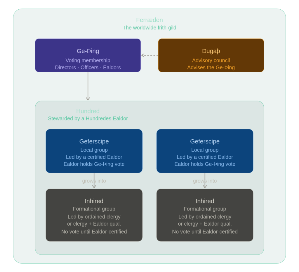 The Ingwina Ferræden is organized as a Friðgild—a peace-guild, in the manner of the ancient Germanic tradition—a voluntary sworn fellowship of local communities united by shared faith, mutual obligation, and the bonds of friþ. Rather than functioning as a top-down ecclesiastical body, the Ferræden operates as a confederation of kindreds and férscipas, each largely autonomous in its local affairs, but bound together through common tenets, a governing compact, and the shared responsibilities of membership. Each férscipe is represented in the governing body of the Ferræden by an Ealdor-sacerd (High Priest/ess), who serves as both its administrative and spiritual leader.