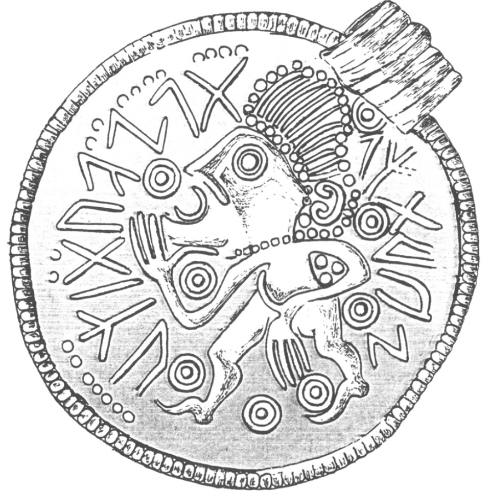 Bracteate IK 128b from Klaus Düwel. “The Inscriptions on Gold-Bracteates and their Relation to Letter and Alphabet Mysticism in the Late Antiue Tradition”. Quaestiones Medii Aevi Novae 23:27-45, Pg. 39