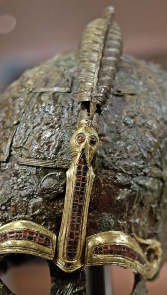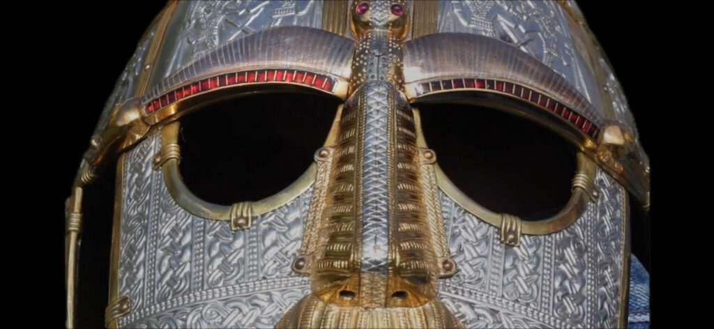 The purse lid of the Sutton Hoo burial features two separate males figures each between two animals, possibly wolves. The figure on the right-side has a gouge mark upon it’s left eye (which is the same side as the helmet) (pg. 528, Mortimer, Price). The whetstone sceptre of the burial features eight faces, one the faces has an alteration to it’s left eye, which has been stricken out and enlarged, making it appear hollow in comparison to the face’s right eye. The whetstone is made of greyscale, a substance which is harder than iron and quite difficult to carve, and therefore no doubt this feature was deliberate (pg.529). As for the garnet-eyes of the animal head terminal in the crest of the Helmet– the left eye is missing a foil, whereas the right eye of the animal head isn’t. (pg.519, 521) Although it’s not as prominent in contrast as the garnets under the helmet’s right-eye it’s interesting to point out that another grave find has a strikingly similar characteristic: the helmet from the Valsgårde grave 7 in Sweden, dated to 620-710 AD– the walu-crest of helmet the proper left eye garnet of the animal terminal above the helmet face is missing a golden foil backing, which expresses the differences between both eyes, along with being of a darker colour garnet making this feature more pronounced, although similar to the Sutton Hoo Helmet (pg.522-523).